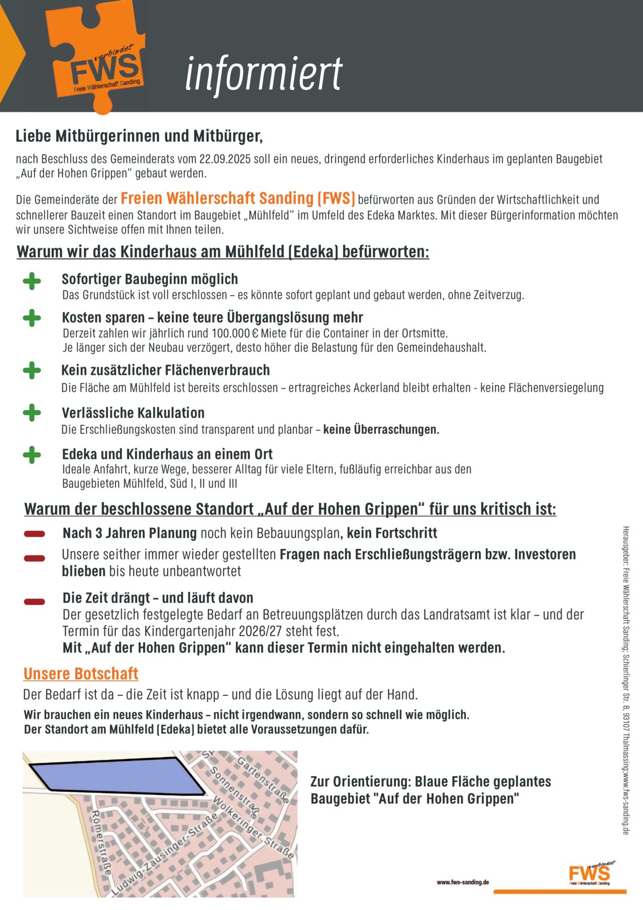 Erst mit der Erschließung des Baugebiets Mühlfeld 1 konnten diese Entwicklungsziele endlich verwirklicht und vertraglich gesichert werden. Der Supermarkt ist mittlerweile eröffnet und erfreut sich großer Beliebtheit bei den Bürgerinnen und Bürgern. Ebenso hätte eine Einrichtung für Senioren – sowohl Wohn- als auch Pflegeangebote – bereits im Bau sein können, sofern Bürgermeister Parzefall und die Mehrheit des Gemeinderates sich von dem Baugebiet „Auf der Hohen Grippen“ distanziert hätten.