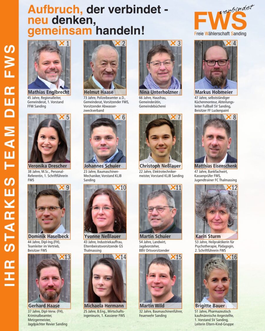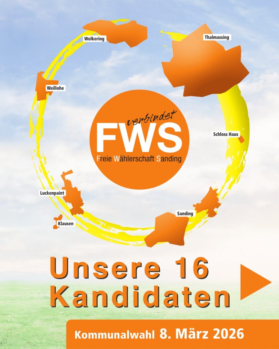 am 08. März 2026 entscheiden Sie, in welche Richtung sich unsere Gemeinde in den kommenden Jahren entwickeln wird. Ich kandidiere als neuer Bürgermeister für die Freie Wählerschaft Sanding (FWS), weil Thalmassing jetzt klare Entscheidungen, neue Impulse und eine verlässliche Führung braucht. Ich stehe für eine bodenständige, unabhängige und sach orientierte Kommunalpolitik, nah an den Menschen und mit dem festen Willen, unsere Gemeinde finanziell stabil und zukunftssicher aufzustellen.